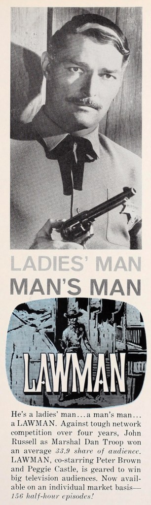 One of my favorite shows is Lawman, a Warner Bros. western in production from 1958 to 1962. Lawman featured John Russell as Marshal Dan Troop of Laramie, Wyoming, who could draw pretty fast but lived more by an unwavering moral compass. Season one went well for Lawman in a booming period for television westerns, so for season two they decided to write in a love interest for Dan Troop (a couple of prospects had washed out in season one because of lack of pizzazz and chemistry with Russell). Warner Bros. hired 32-year-old Peggie Castle for the role, she the star of some noir B and costume pictures made throughout the 1950s. Sure, she had some roles in A pictures, but more often she made an impression as the “other woman” who was murdered in the second reel. The nasty film noir 99 River Street comes to mind.